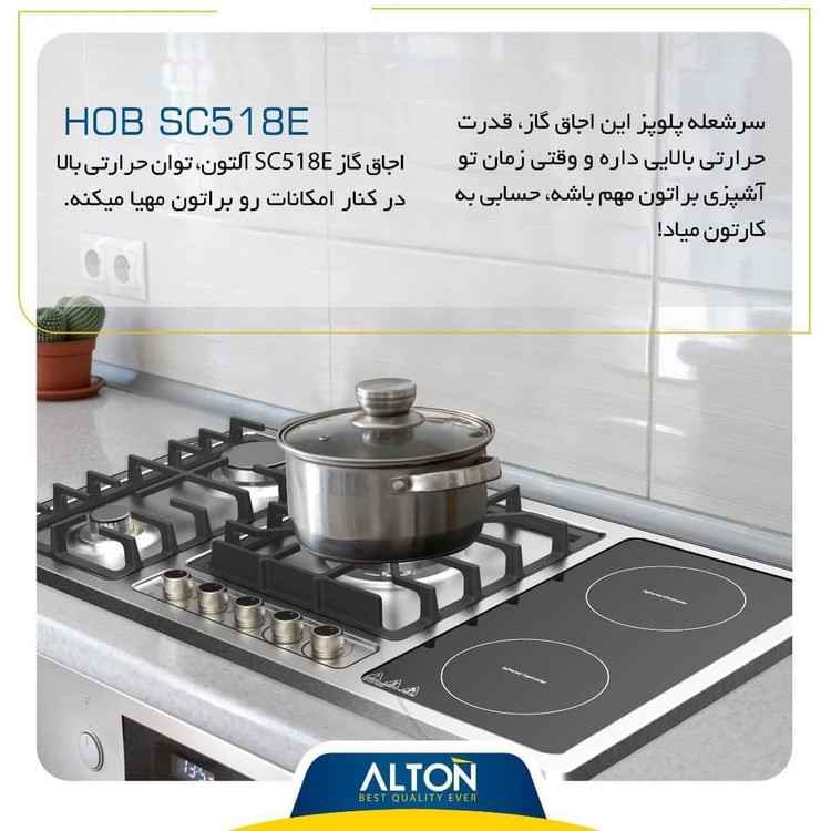 اجاق آلتون مدل SC518EN این اجاق گاز صفحه ای پنج شعله می باشد (دو شعله سمت راست برقی و دو شعله سمت چپ و سرشعله پلوپز با گاز ) سرشعله پلوپز در وسط اجاق گاز قرار گرفته که با توان حرارتی بالا می باشد، این مدل مانند تمامی اجاق گازهای برند آلتون دارای ترموکوپل تاپ تایم می باشد