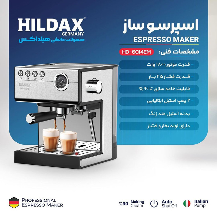 اسپرسو ساز هیلداکس مدل HD-6014EM اسپرسوساز برند محبوب هیلداکس که بهعنوان یکی از جدیدترین و پرطرفدارترین اسپرسوسازهای موجود در بازار، توانسته است توجه بسیاری از علاقهمندان به قهوه را به خود جلب کند. در نحوه عملکرد پمپ قوی با فشار 25 بار و توانایی تهیه اسپرسو با کیفیت در منزل است. این دستگاه امکان به دست آوردن نوشیدنیهایی با طعم و عطر حرفهای را به کاربران خود میدهد، مانند همانطور که یک کافه ماهر یا باریستای حرفهای میتواند فراهم کند این دستگاه با طراحی مدرن، کیفیت ساخت برتر و قابلیتهای منحصر به فرد، تجربهای بهیادماندنی از طعم و عطر یک اسپرسو باکیفیت را به کاربران خود ارائه میدهد.